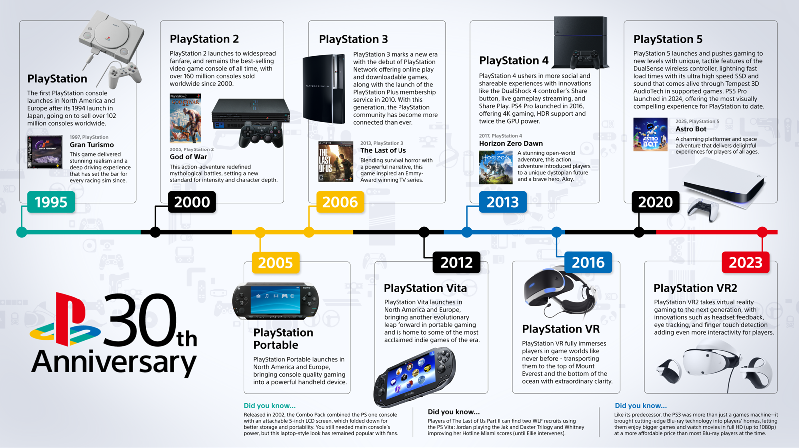 SIE ha inoltre voluto ringraziare i partner media che hanno accompagnato questo percorso. Per approfondire i 30 anni di PlayStation in Europa, il PlayStation.Blog offre un video celebrativo con i momenti più amati dai fan, condivisi con l’hashtag #PlayStation30Memories. Una grafica con le tappe fondamentali della storia PlayStation è disponibile anche sul Press Server di SIE.