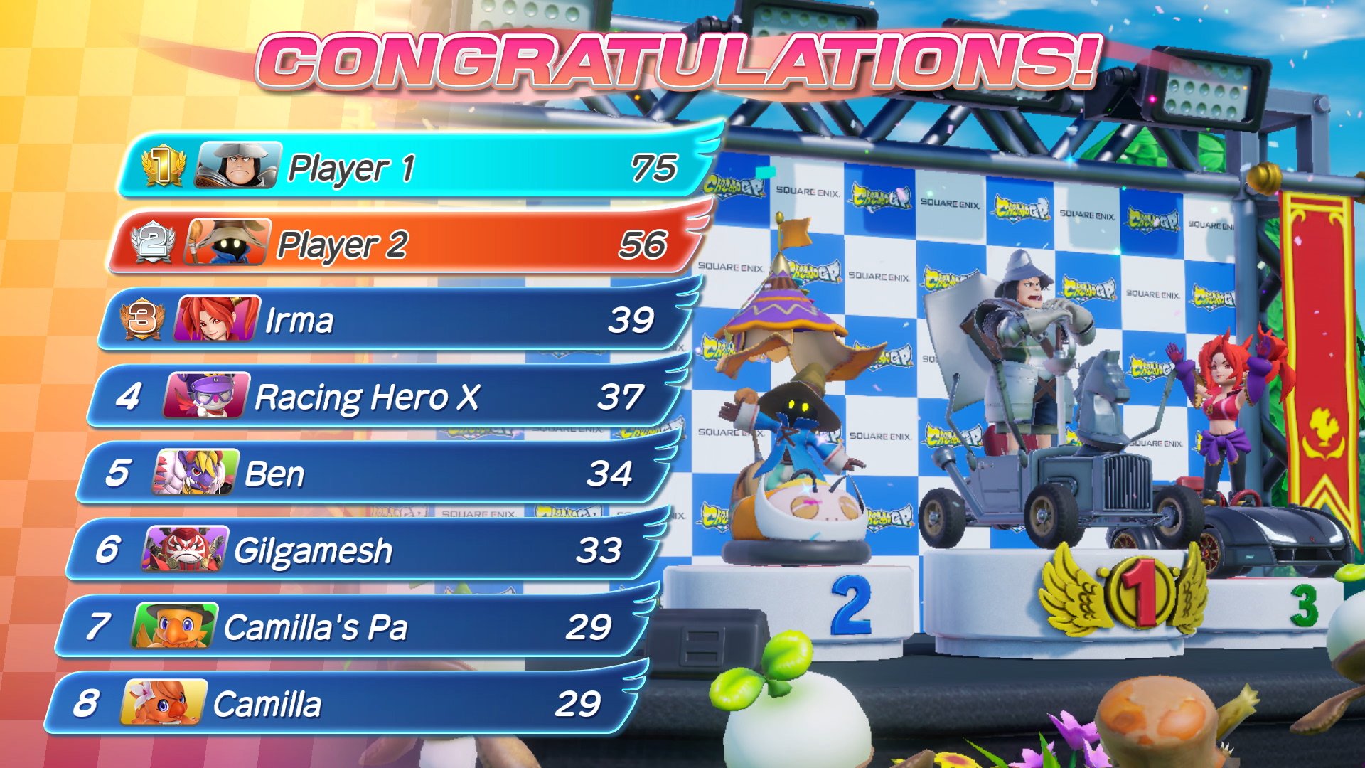 Lato grafico il titolo è assai riuscito. I personaggi sono gradevole e ben caratterizzati, la cosmesi dei percorsi è ben riuscita e l’aspetto tecnico è assai apprezzabile. Anche il framerate funziona, pur dimezzato in confronto a Mario Kart. La colonna sonora è invece quella di sempre, tratta evidentemente dai temi di Final Fantasy.