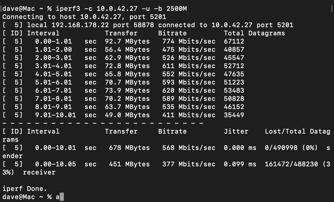 Per quanto riguarda FRITZ!Repeater 1610 Outdoor, le prestazioni si sono rivelate adeguate per l’uso esterno, pur senza raggiungere i picchi della sorgente. Nei test di throughput puro (iPerf UDP), un MacBook Pro M4 connesso al 1610 ha mantenuto una velocità di trasferimento di circa 568 Mbits/sec, mentre lo Z Fold 7 si è assestato su 263 Mbits/sec. Anche i test di velocità internet (Fast.com) hanno confermato questi valori, con il Mac a 330 Mbps e lo smartphone a 260 Mbps. Sono valori eccellenti per gestire videocamere 4K o navigazione in giardino, considerando che stiamo parlando di un ponte Wi-Fi 6 2×2.