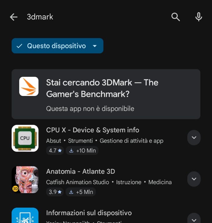 Sotto la scocca batte il nuovo processore Google Tensor G5, affiancato da 16 GB di RAM. Come si comporta? Nell’uso quotidiano è fluido, reattivo e, fortunatamente, scalda molto meno dei predecessori. Tutto bene, no? Beh, c’è una cosa che ci ha fatto molto strano. Abbiamo provato a installare le nostre solite app di test, Geekbench e 3D Mark, per darvi qualche numero… e non ci siamo riusciti. Non sono disponibili per il dispositivo, o quantomeno risultano bloccate/incompatibili sul Play Storw, costringendo al sideloading per chi vuole proprio vedere i numeri.