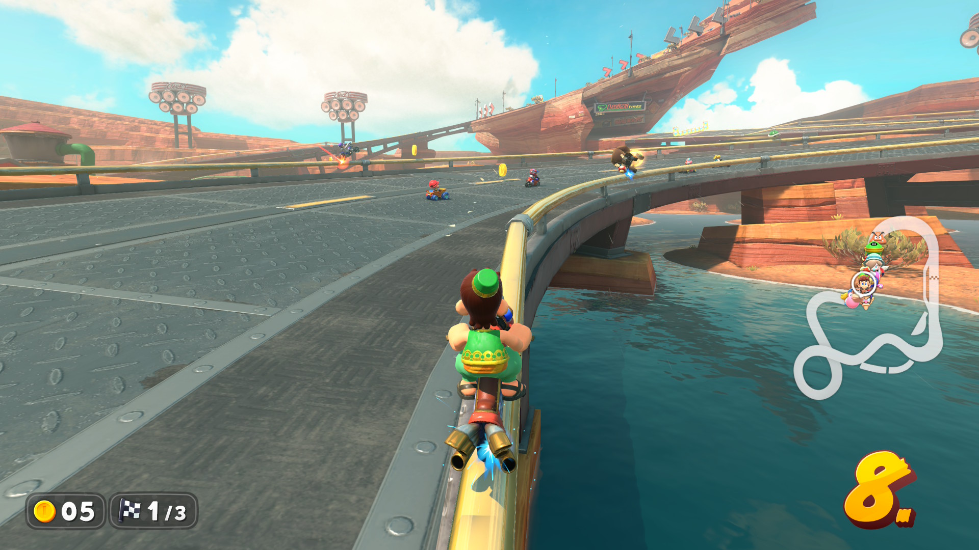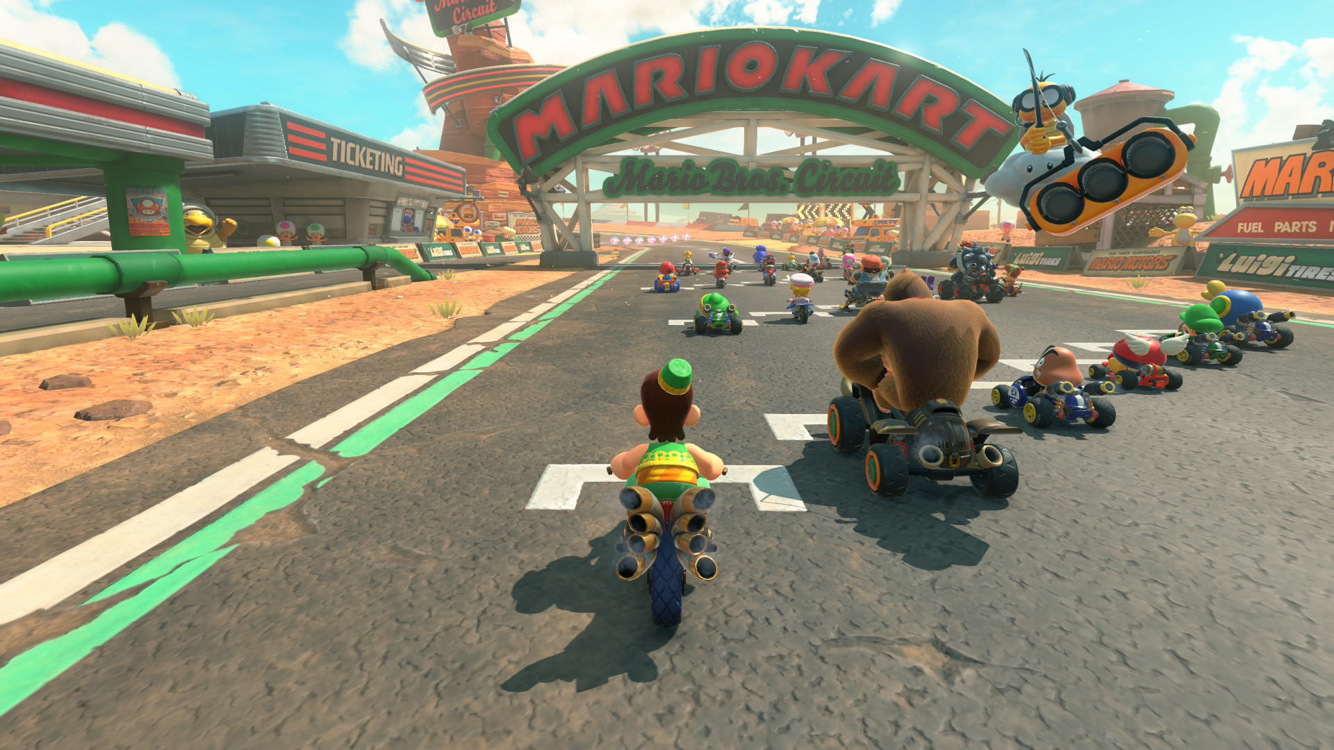 La stessa è stata creata da Atsuko Asahi, nota compositrice all’interno di Nintendo EPD e famosa per aver già lavorato su Mario Kart 8, Animal Crossing: New Leaf, Pikmin 3 e ARMS. La cura per la colonna sonora è fenomenale e le tracce dedicate a vecchie glorie e non solo si sposano perfettamente per ogni tracciato che questo nuovo capitolo offre. Ad esempio, alla pista dedicata Mario e a Donkey Kong (DK Spaceport), nella parte finale la ripresa della traccia Baby Park (Mario Kart Double Dash) arrangiata dalla compositrice ivi menzionata ci ha stupito positivamente. Ma non solo. Per i tracciati ambientati nella spiaggia, il richiamo a Super Mario Sunshine è decisamente palese e il lavoro certosino dietro alla colonna sonora merita una “sonora” menzione d’onore.