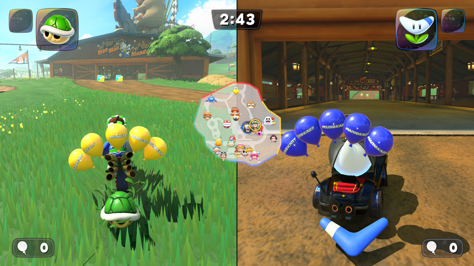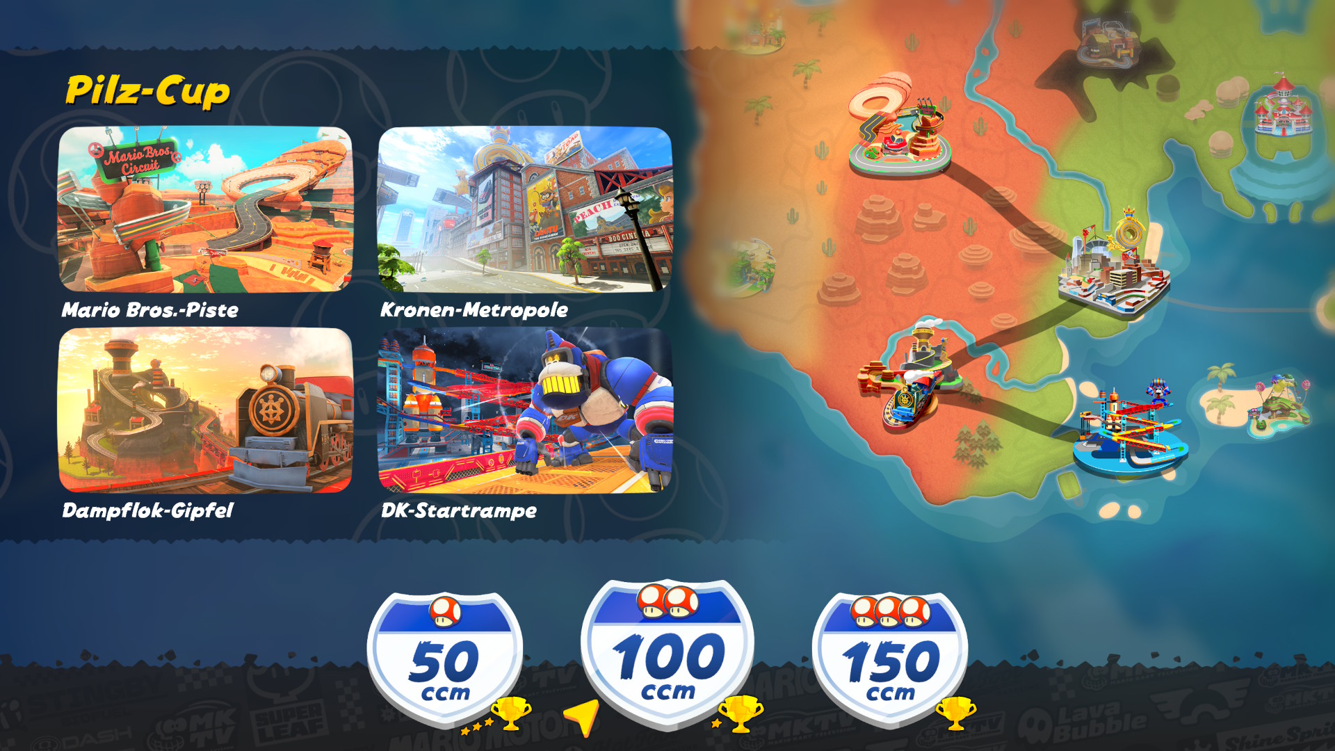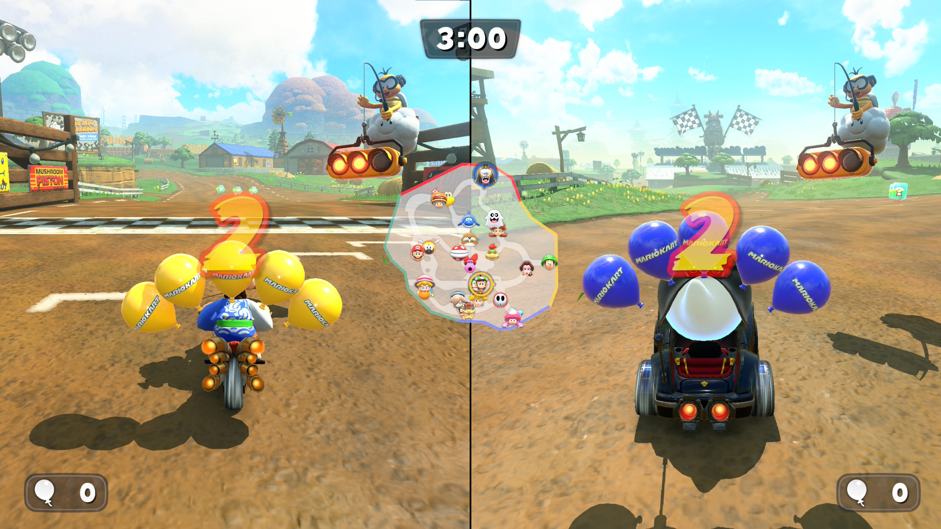 Lanciando per la prima volta Mario Kart, l’utente viene accolto con un tema country e gioioso e molto orecchiabile in cui il giocatore è catapultato nel menù principale. Dal menù è possibile accedere alle differenti modalità di gioco, ovvero un giocatore, più giocatori, online e modalità locale sfruttando la funzionalità GameShare, eredità di Download DS nata all’epoca del Nintendo DS (2004), che consiste di condividere il gioco per un’altra console sprovvista. Al loro interno, non manca il Gran Premio nelle tre modalità 50, 100 e 150cc, Sopravvivenza, Prove a tempo, Corsa sfida e Battaglia (Battaglia palloncini e acchiappa monete). Gran Premio, Prove a tempo, Corsa sfida e Battaglia sono canonici della serie e non introducono particolari novità. Le stesse sono modalità rodate e dei “more of the same” di cui non ci dilungheremo troppo in questa recensione. La novità di questo capitolo risiede di per sé nella modalità Corsa libera, ovvero la openmap menzionata poc’anzi che consente di esplorare la mappa del mondo di gioco liberamente, passando da un tracciato e l’altro senza caricamenti. Ma ci torneremo più tardi.