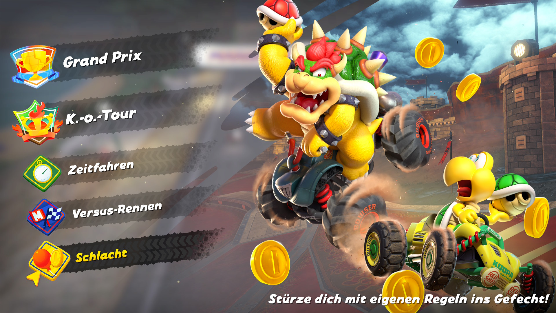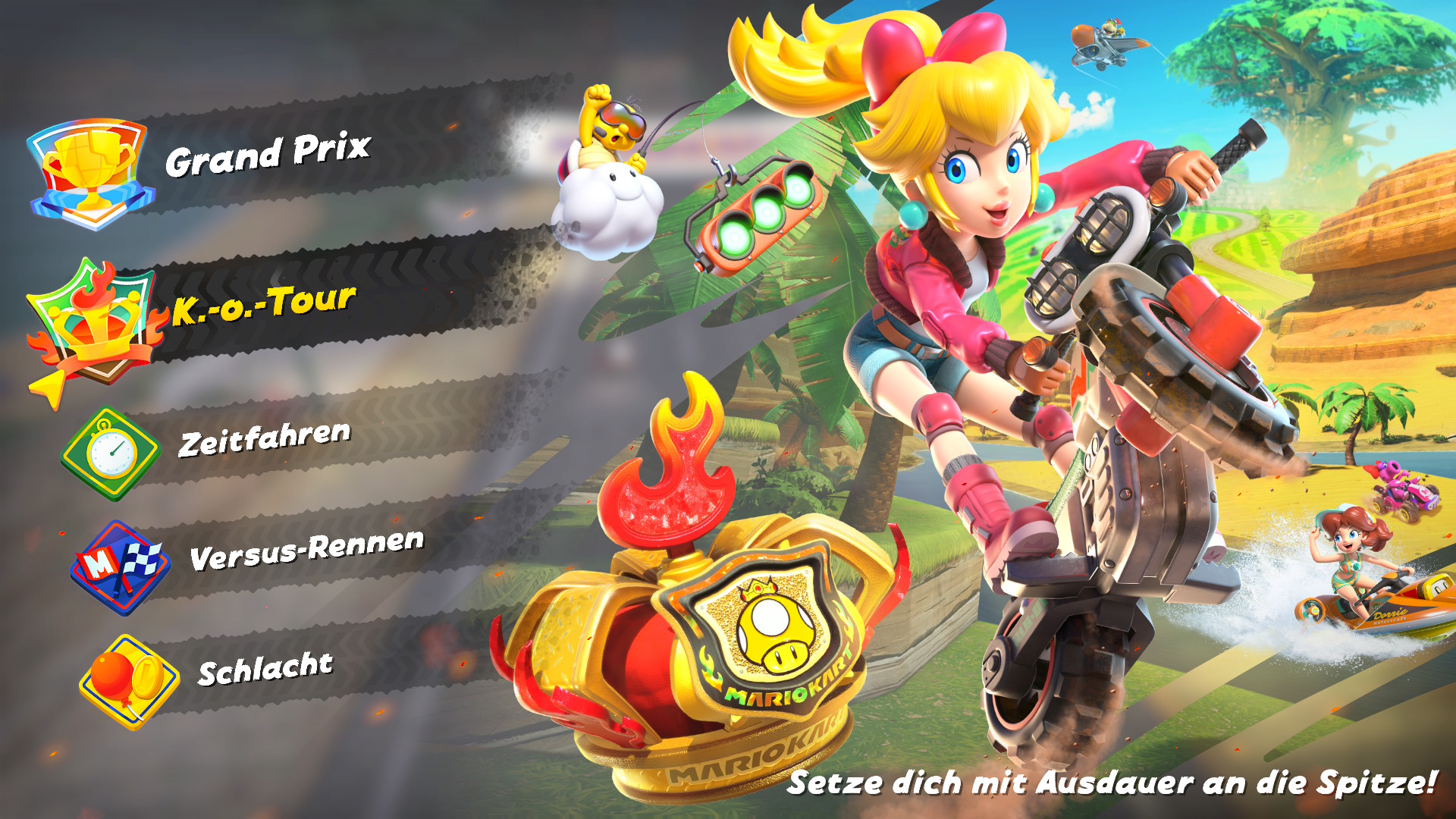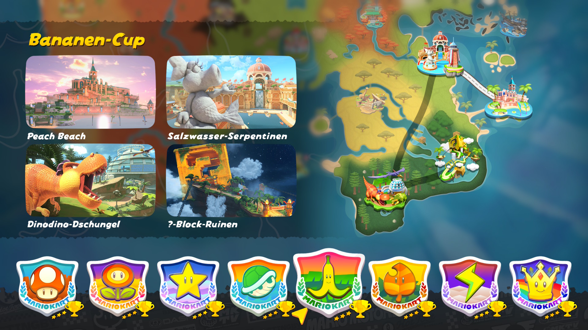 Lanciando per la prima volta Mario Kart, l’utente viene accolto con un tema country e gioioso e molto orecchiabile in cui il giocatore è catapultato nel menù principale. Dal menù è possibile accedere alle differenti modalità di gioco, ovvero un giocatore, più giocatori, online e modalità locale sfruttando la funzionalità GameShare, eredità di Download DS nata all’epoca del Nintendo DS (2004), che consiste di condividere il gioco per un’altra console sprovvista. Al loro interno, non manca il Gran Premio nelle tre modalità 50, 100 e 150cc, Sopravvivenza, Prove a tempo, Corsa sfida e Battaglia (Battaglia palloncini e acchiappa monete). Gran Premio, Prove a tempo, Corsa sfida e Battaglia sono canonici della serie e non introducono particolari novità. Le stesse sono modalità rodate e dei “more of the same” di cui non ci dilungheremo troppo in questa recensione. La novità di questo capitolo risiede di per sé nella modalità Corsa libera, ovvero la openmap menzionata poc’anzi che consente di esplorare la mappa del mondo di gioco liberamente, passando da un tracciato e l’altro senza caricamenti. Ma ci torneremo più tardi.