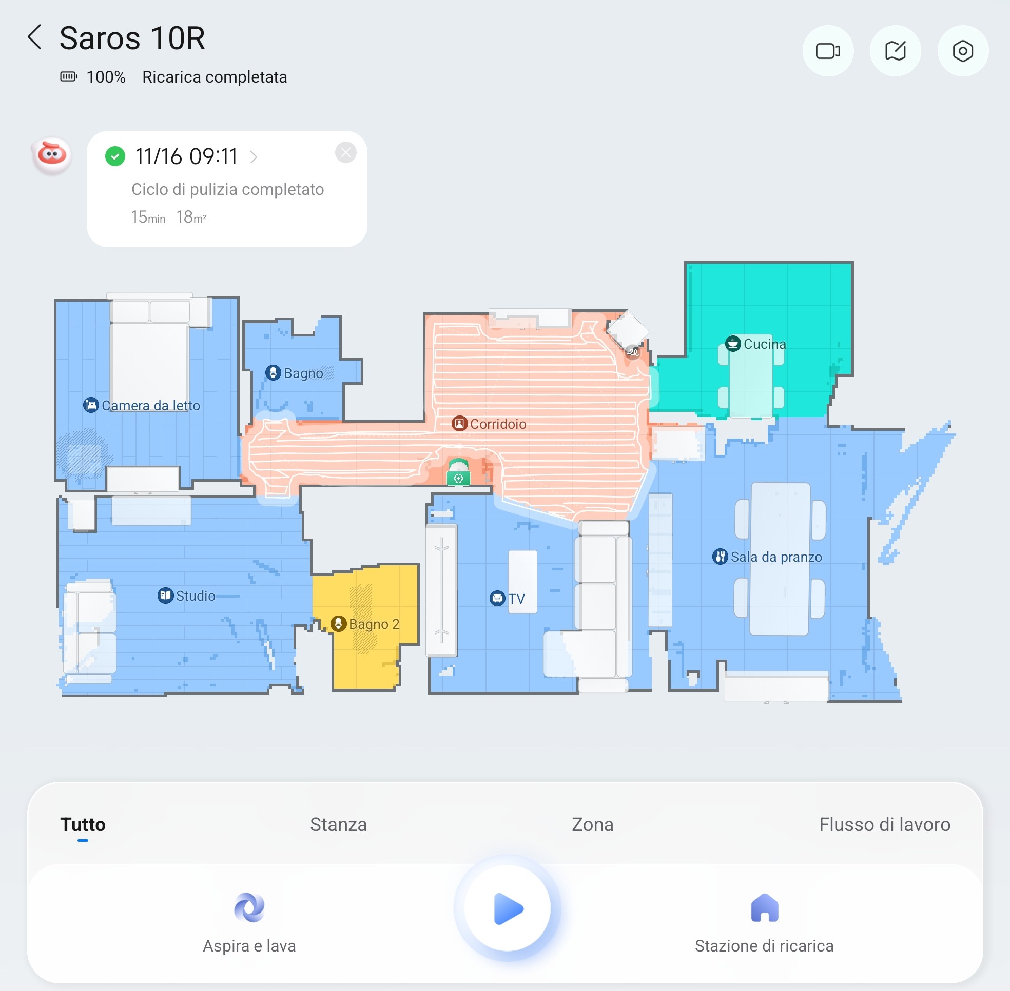 L’app Roborock si conferma tra le più mature e complete sul mercato. Permette una personalizzazione totale: dalla gestione dei tappeti (con sollevamento automatico dei mop di 12 mm o il loro sgancio magnetico e deposito alla base per cicli “solo aspirazione” ) all’attivazione selettiva dei bracci FlexiArm , fino a routine specifiche per animali domestici che migliorano il riconoscimento. È presente anche la funzione di videosorveglianza remota tramite la telecamera RGB.