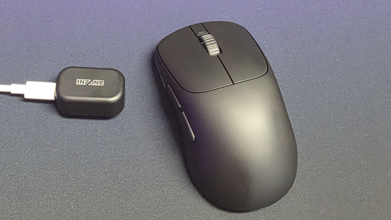 L’estetica dell’INZONE Mouse-A è talmente sobria che, se non fosse per il piccolo logo serigrafato sul lato, potrebbe essere facilmente confusa con un Logitech G Superlight o l’Harpe II Ace di Asus, il che rappresenta comunque un complimento per la pulizia delle linee e l’ergonomia. La scocca in plastica matte densa offre un feeling premium al tatto e una presa solida, anche se il rivestimento tende purtroppo a comportarsi come una calamita per impronte, richiedendo una pulizia frequente per mantenere l’aspetto originale. Una scelta progettuale decisamente fuori dal comune riguarda il sistema di ricarica e connessione: il dongle rettangolare separato si collega via USB-C e ha la sua porta sul lato invece che dietro. Il mouse invece ha la sua porta di ricarica davanti, come tutti gli altri mouse in circolazione (tranne quelli di Apple…). Nulla da dire sul mouse ma il dongle è un po’ strano, inadatto ad essere usato con un laptop da gaming e spenzolante (o in mezzo alle scatole sulla scrivania) visto il lungo cavo USB fornito da Sony. Avremmo decisamente preferito una classica chiavetta USB.