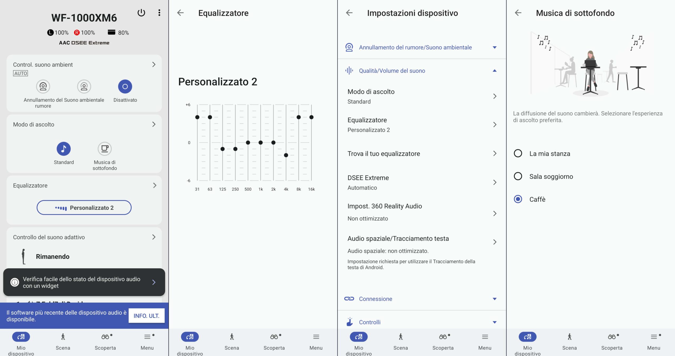 La nuova app Sound Connect ha subito un restyling che finalmente introduce una regolazione granulare dell’equalizzatore a 10 bande, permettendo di regolare il suono in modo molto più preciso rispetto alle vecchie 5 bande. Abbiamo invece trovato perfettamente inutile il sound 360, una tecnologia che soffre della mancanza di contenuti supportati dai grandi servizi di streaming, così come la modalità musica di sottofondo che dovrebbe simulare la diffusione ambientale ma che all’atto pratico finisce solo per allontanare troppo il suono dalle orecchie. Rimane l’ottimo sistema Quick Attention che permette di abbassare il volume istantaneamente coprendo l’auricolare sinistro, una delle funzioni più comode e intelligenti mai create da Sony.