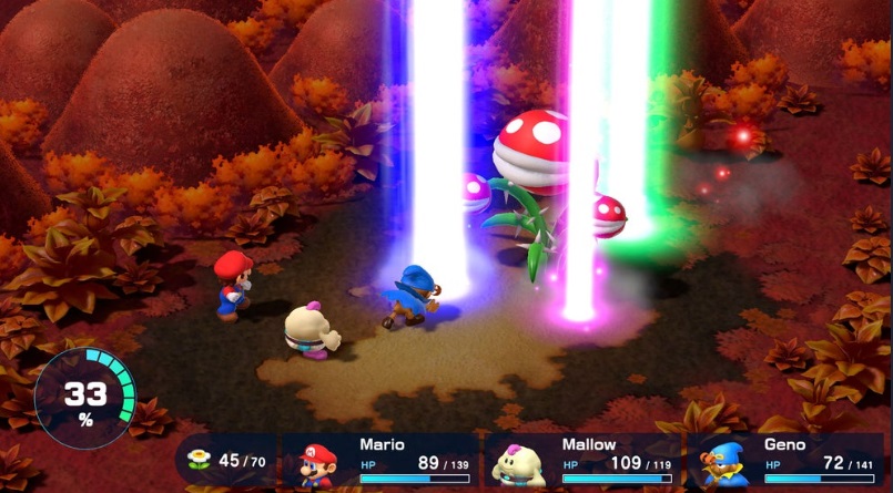 Pertanto, Super Mario RPG è un remake riproposto oggi con grafica rielaborata, mantenendo inalterato il gioco base del 1995. Il team di sviluppo dietro questo remake è lo studio giapponese ArtePiazza, noto per il suo coinvolgimento nella serie Dragon Quest (fino a Dragon Quest 3 nel 1996). Lo studio si è occupato dei remake di titoli Square Enix per Playstation 2 e Nintendo DS. Inoltre, sembra che Nintendo Picture abbia fornito l’animazione dei personaggi (lo si nota negli attacchi di gruppo), mentre la compositrice è Yoko Shimomura. Super Mario RPG è la genesi di Mario & Luigi e del gameplay dei Paper Mario, ovvero un gioco di ruolo mariesco semplice con meccaniche ruolistiche a turni, ma con una certa interattività, tipica dei giochi a 16 bit dell’epoca. Di fatto, gli scontri a turni introducono alcune meccaniche basate sulla pressione dei pulsanti durante le fasi di attacco e difesa, un sistema che ha poi ispirato il gameplay di Paper Mario e Mario & Luigi. L’esplorazione del mondo si basa sull’esplorazione isometrica con telecamera dall’alto e sessioni platform tipiche del brand, coinvolgendo maggiormente le abilità del giocatore. Manifesto è comunque l’obiettivo di preservare il feeling del gioco originale, aggiornando la cosmesi ma senza modificare le animazioni base, il character design e i testi. Infatti, per una maggiore immersione retro, è possibile reimpostare la colonna sonora originale, già creata da Yoko Shimomura.
