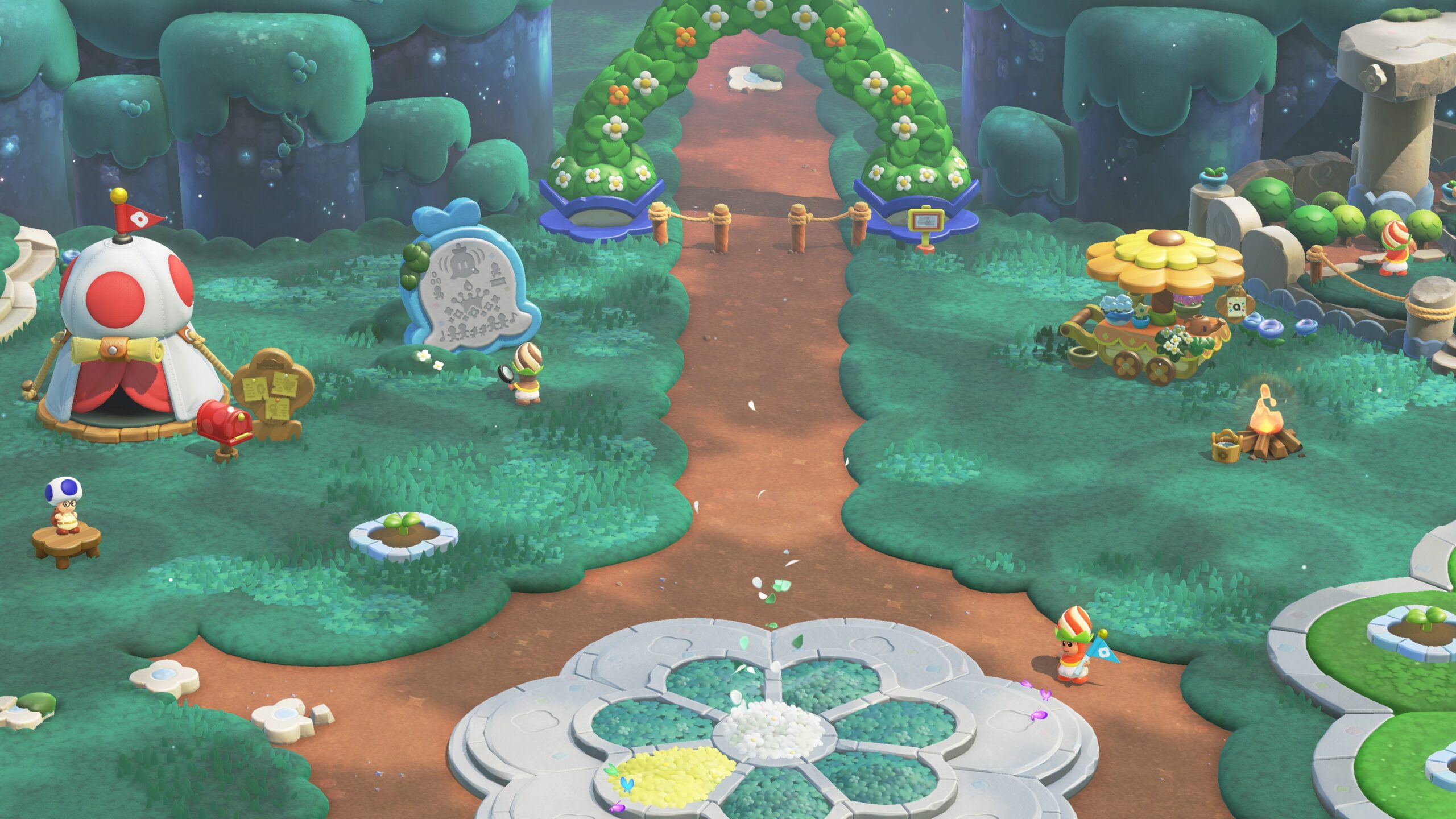 A sud dell’Area delle attrazioni Bellabel si trova il Campo Base che introduce una serie di sfide a difficoltà crescente richiedendo il completamento di obiettivi specifici, come eliminare tutti i nemici o rispettare rigorosi limiti di tempo, sfruttando, appositamente, i poteri delle nuove Spille. Le spille doppie sono un’altra novità di questo contenuto aggiuntivo. Nel gioco standard le spielle permettono di sbloccare una mossa aggiuntiva e possono essere intercambiate a piacimento all’inizio di ogni livello. Le doppie spille promettono lo stesso, ma invece che una mossa, ne offre due. Per intenderci, se con una spilla era possibile planare con il cappello e con un’altra di correre molto velocemente, ora la doppia spilla permette di fare entrambe le cose. Ritornando al campo base, le sfide proposte obbliga appunto l’uso di abilità peculiari in percorsi strutturati su misura. Oltre alle sfide sono stati introdotti i Browserotti, gli scagnozzi di Bowser i quali hanno rubato i Fiori Bellabel dal parco divertimenti. In sostanza si tratta di riaffrontare i livelli già noti sotto un’altra veste, cercando di recuperare i Fiori Bellabel rubati dagli scagnozzi: in altre parole, si tratta in pratica di livelli rivisti e come alternativa alle dimensioni modificate dai Fiori meraviglia, sulla scorta dello stesso concetto di Kirby e la terra perduta Nintendo Switch 2 Edition + Il mondo astrale. Nintendo, con la Nintendo Switch 2 Edition di Super Mario Wonder, ha introdotto per il singolo giocatore una rivisitazione dei livelli già noti senza andare troppo a modificarne le fondamenta, proponendo alla fine di ogni stage il boss scagnozzo che ha rubato il fiore in questione. Unico neo è la quantità di questi livelli rivisti, davvero pochi e non particolarmente longevi.