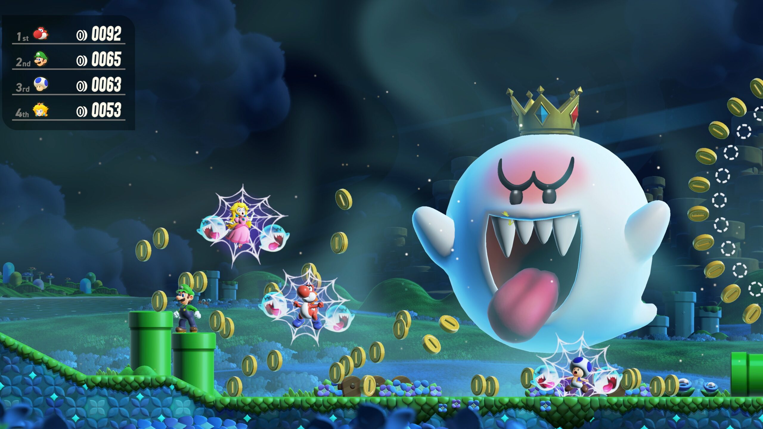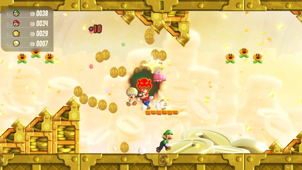 Tuttavia, il vero punto di forza di questa espansione risiede nel multigiocatore, in cui le attrazioni del Parco Bellabel sembra una specie di mini Mario Party di soli minigiochi platform integrato in un episodio tradizionale e bidimensionale del brand. Menzioniamo una specie, sicché, in assenza di altri giocatori, non sarà possibile visitare tali attività da soli in compagnia della CPU. Il Parco Bellabel si divide in tre grandi aree dedicate al gioco in compagnia: una per le sfide competitive versus in locale, una con altri giocatori in cooperativa (sempre in locale), mentre l’ultima si focalizza sull’online. La similitudine con Mario Party non è per l’eterogeneità dei giochi, quanto piuttosto nella semplicità dei minigiochi proposti perfettamente integrata al gameplay platform di Super Mario, che rende questo contenuto aggiuntivo un tripudio di idee che invoglia a provarle tutte. La Piazza multiplayer locale è certamente la modalità del parco con più attrazioni, per un totale di 17, e offre minigiochi come une specie di costruttore di blocchi (mentre l’altro utilizza un personaggio in maniera standard, oppure minigiochi a modo di patata bollente. L’altra modalità, ovvero quella wireless locale o online con altre copie del gioco o sfruttando la modalità GameShare, permette di partecipare fino ad un massimo di 12 giocatori in meno attività ricreative, ma certamente più caotiche.