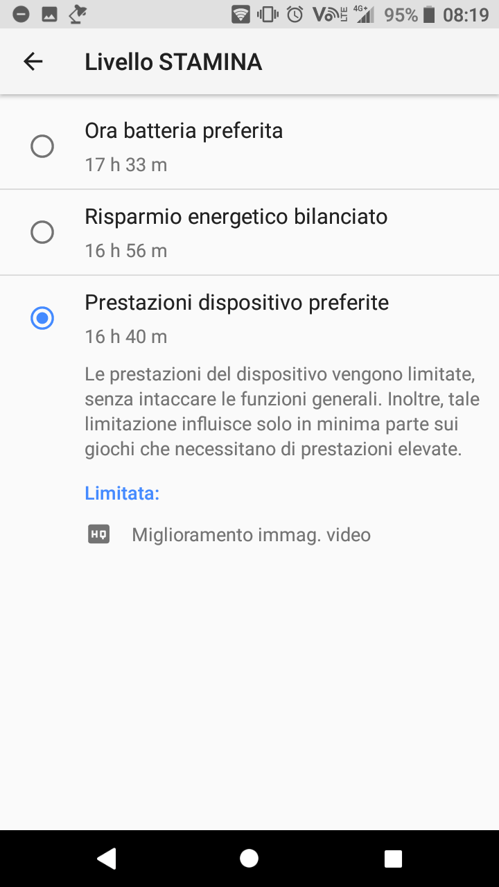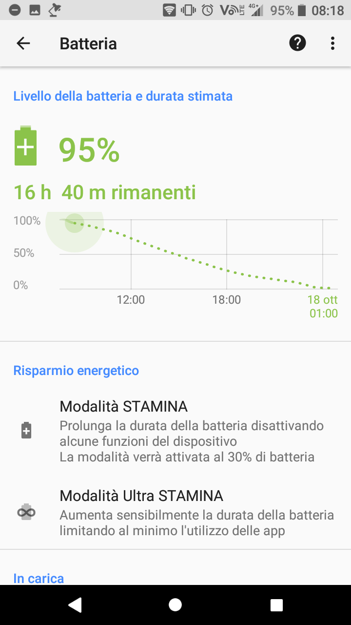Buona l’implementazione di Stamina, storica modalità risparmio energetico di Sony che, per un momento, fu levata con Android Marshmallow per poi essere reintrodotta in Nougat. Ora, con Android Oreo, si sposa perfettamente con le ottimizzazioni del software stock che limita alcuni inutili processi in background. Stamina si attiva automaticamente a partire da una certa percentuale (modificabile dall’utente) ed offre tre differenti profili. Il primo limita i dati, la sincronizzazione automatica, X-Reality Engine e le frequenze della CPU e GPU. Il secondo limita unicamente le frequenze (leggermente e non pesantemente) e la modalità X-Reality Engine. Mentre l’ultimo mantiene le performance inalterate (o quasi) e limita unicamente le personalizzazioni di miglioramento dell’immagini e dei video.