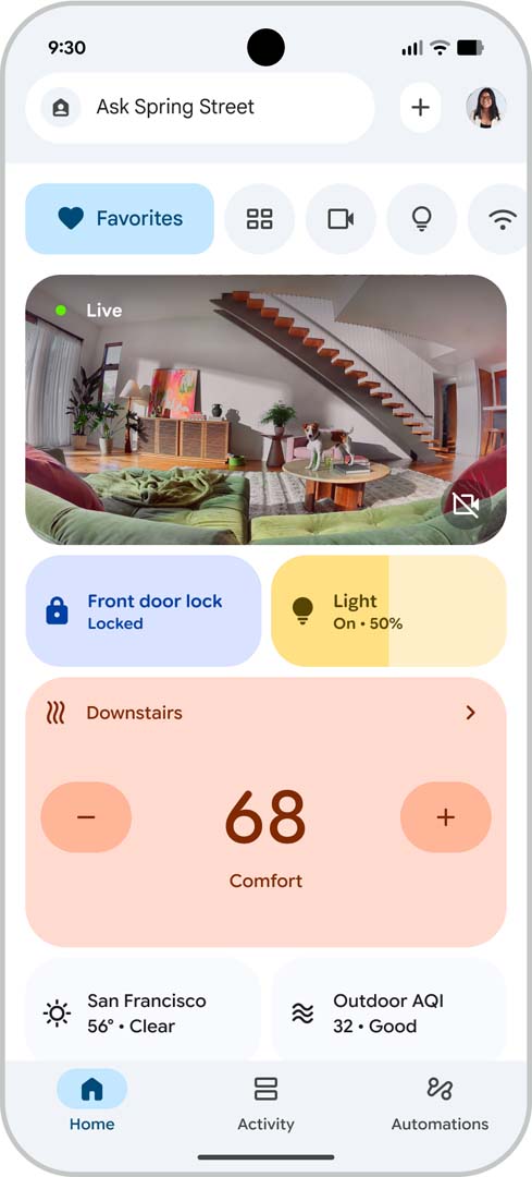 L’applicazione Google Home è stata riprogettata per migliorare prestazioni e affidabilità. L’azienda dichiara tempi di caricamento ridotti fino al 70% su alcuni dispositivi Android, una diminuzione dei crash di quasi l’80% e una visualizzazione live delle videocamere più rapida del 30%. L’app integra ora il supporto per i dispositivi Nest, inclusi i termostati dal 2015, gli avvisi per Nest Protect e la gestione delle password per Nest x Yale Lock. La nuova interfaccia a tre schede (Casa, Attività, Automazioni) è stata ottimizzata per l’uso a una mano e rende la funzione “Ask Home” un elemento persistente.