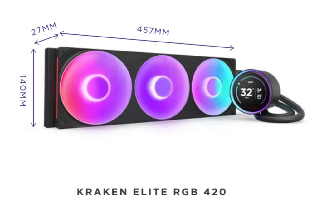 Kraken Elite 420 RGB segna invece l’ingresso di NZXT nel segmento dei dissipatori da 420mm. Questo modello si distingue per le sue dimensioni maggiori incorporando ben tre ventole da 140mm su un unico telaio, promettendo capacità di raffreddamento a dire della società eccezionali e per i sistemi di fascia enthusiast. Si allinea alle caratteristiche degli altri modelli Kraken Elite, aumentando considerevolmente le dimensioni.
